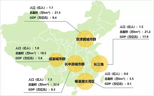 長三角城市群在常住人口、GDP兩個方面在五大城市群中首屈一指,京津冀城市群緊隨其后